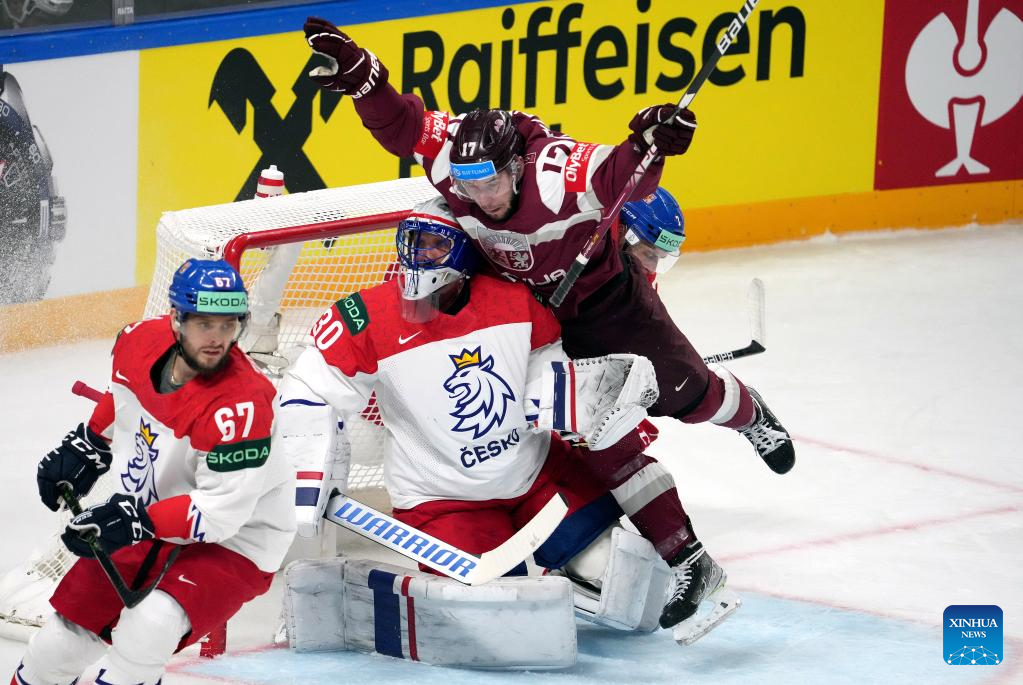 The Czezh Republic's goalkeeper Simon Hrubec (L) makes a save during the Group B match between Latvia and the Czech Republic at the 2023 IIHF Ice Hockey World Championship in Riga, Latvia, May 15, 2023. (Photo by Edijs Palens/Xinhua)