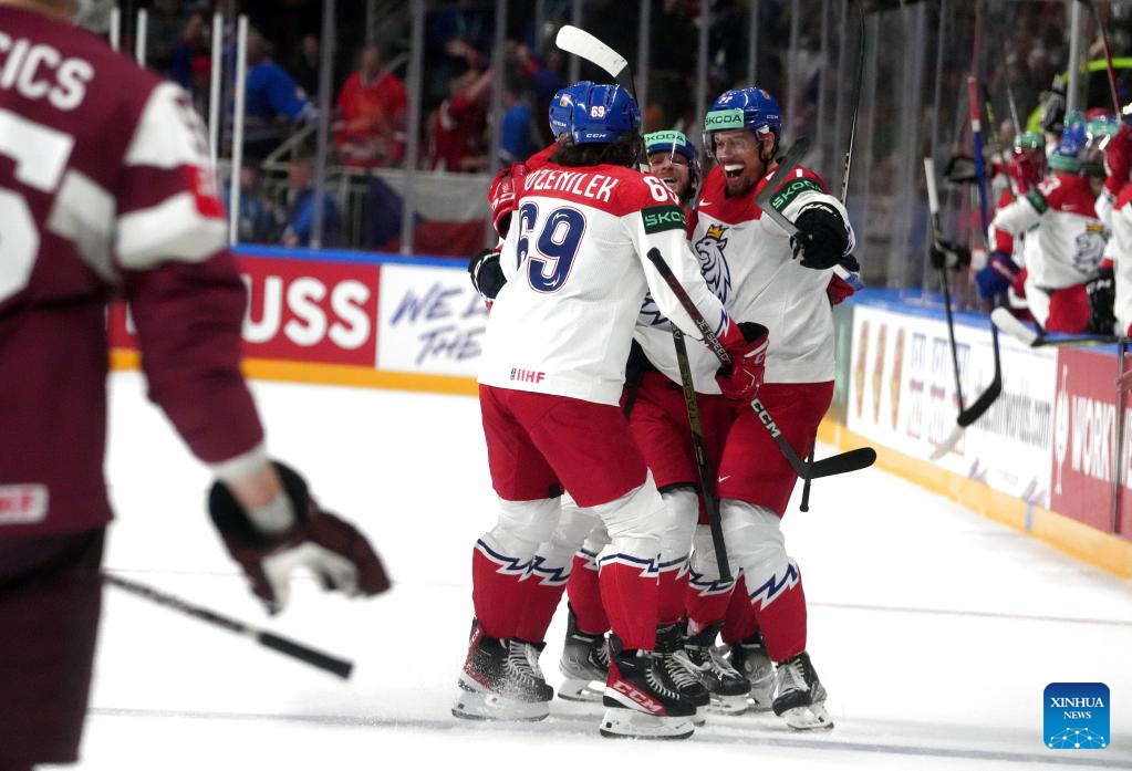 The Czezh Republic's players celebrate after scoring during the Group B match between Latvia and the Czech Republic at the 2023 IIHF Ice Hockey World Championship in Riga, Latvia, May 15, 2023. (Photo by Edijs Palens/Xinhua)