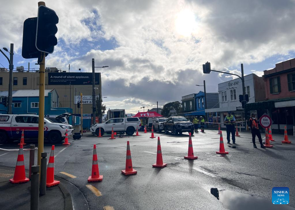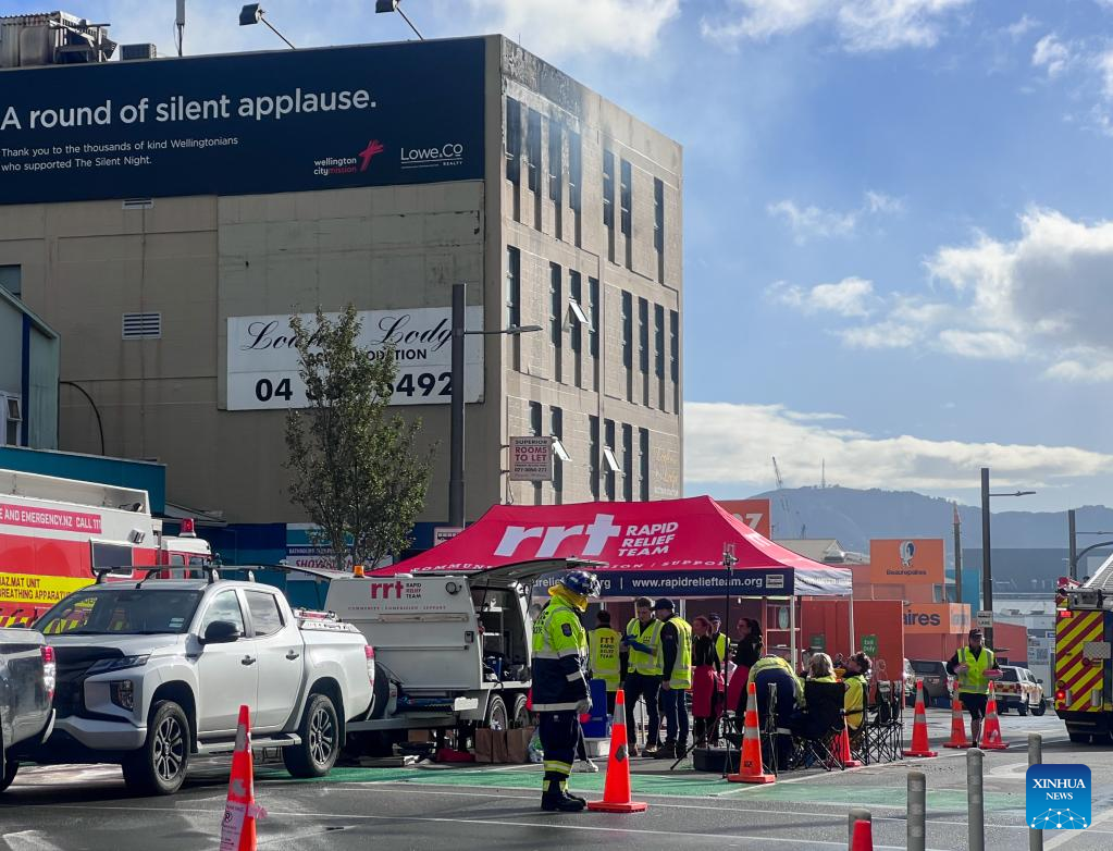 Cordon lines are seen near the fire site of a hostel building in downtown Wellington, New Zealand, on May 16, 2023. Several people were killed and up to 30 others were believed unaccounted for after a blaze broke out overnight at a four-storey hostel building in downtown Wellington, police said on Tuesday. (Xinhua)
