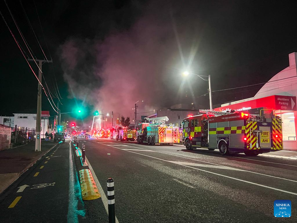 Fire trucks are seen near the site where a fire broke out in downtown Wellington, New Zealand, on May 16, 2023. Several people were killed and up to 30 others were believed unaccounted for after a blaze broke out overnight at a four-storey hostel building in downtown Wellington, police said on Tuesday. (Xinhua)