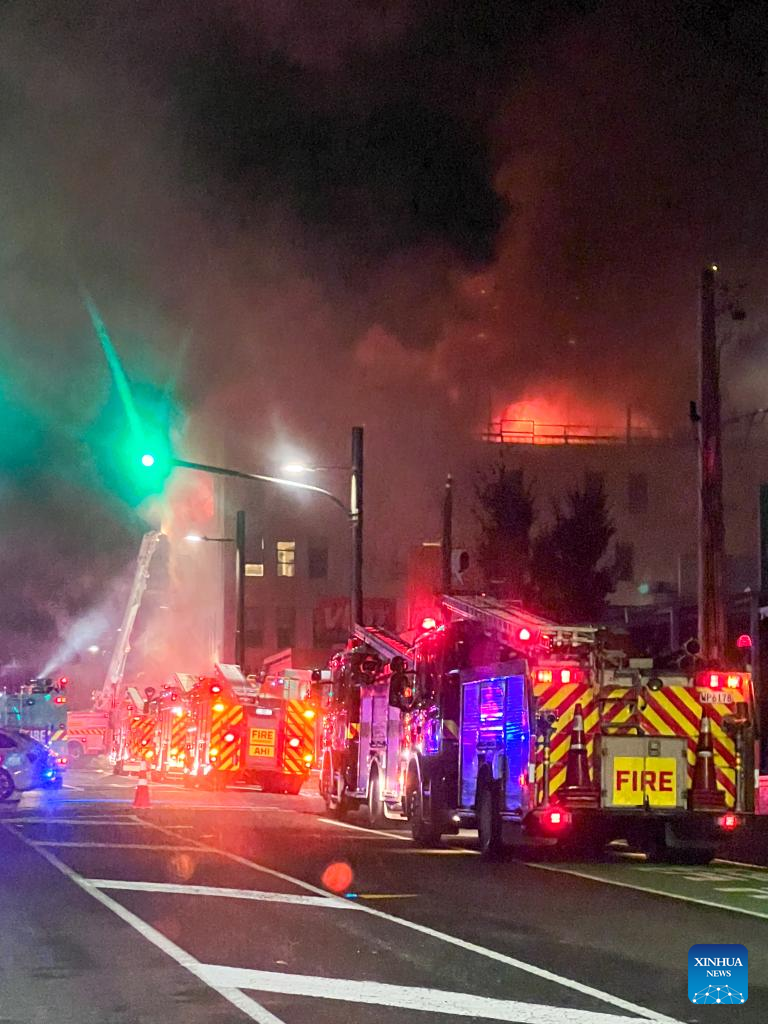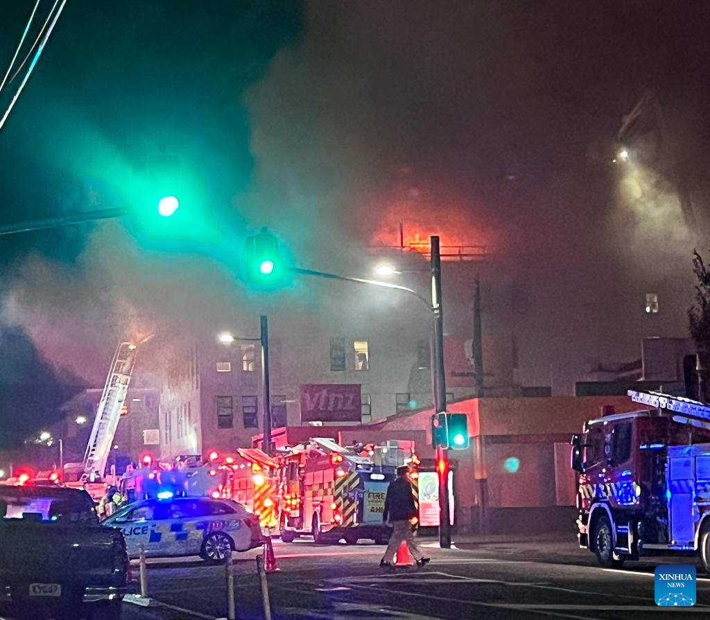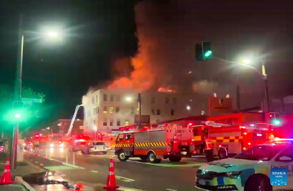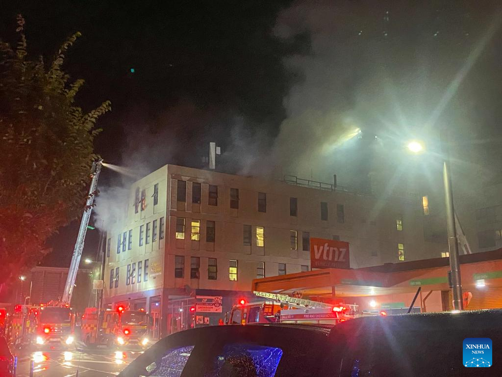 Firefighters battle a fire at the site where a fire broke out in downtown Wellington, New Zealand, on May 16, 2023. Several people were killed and up to 30 others were believed unaccounted for after a blaze broke out overnight at a four-storey hostel building in downtown Wellington, police said on Tuesday. (Xinhua)
