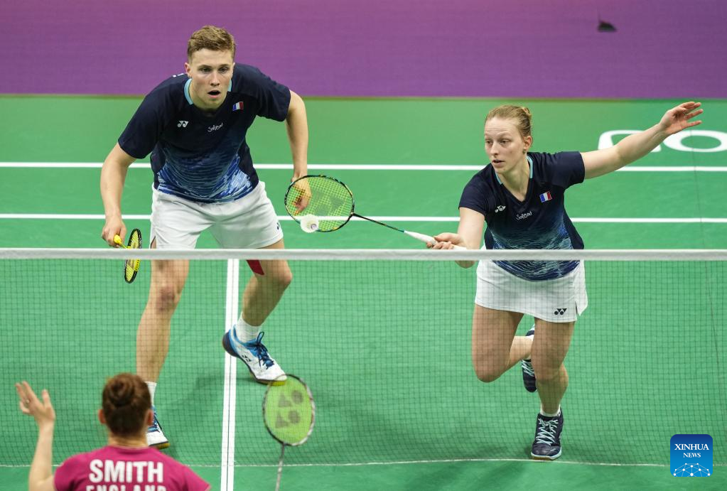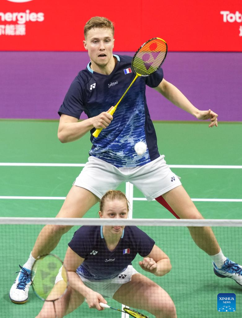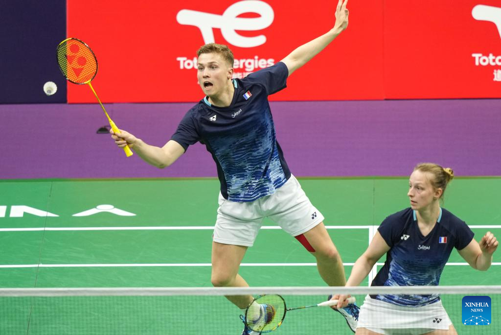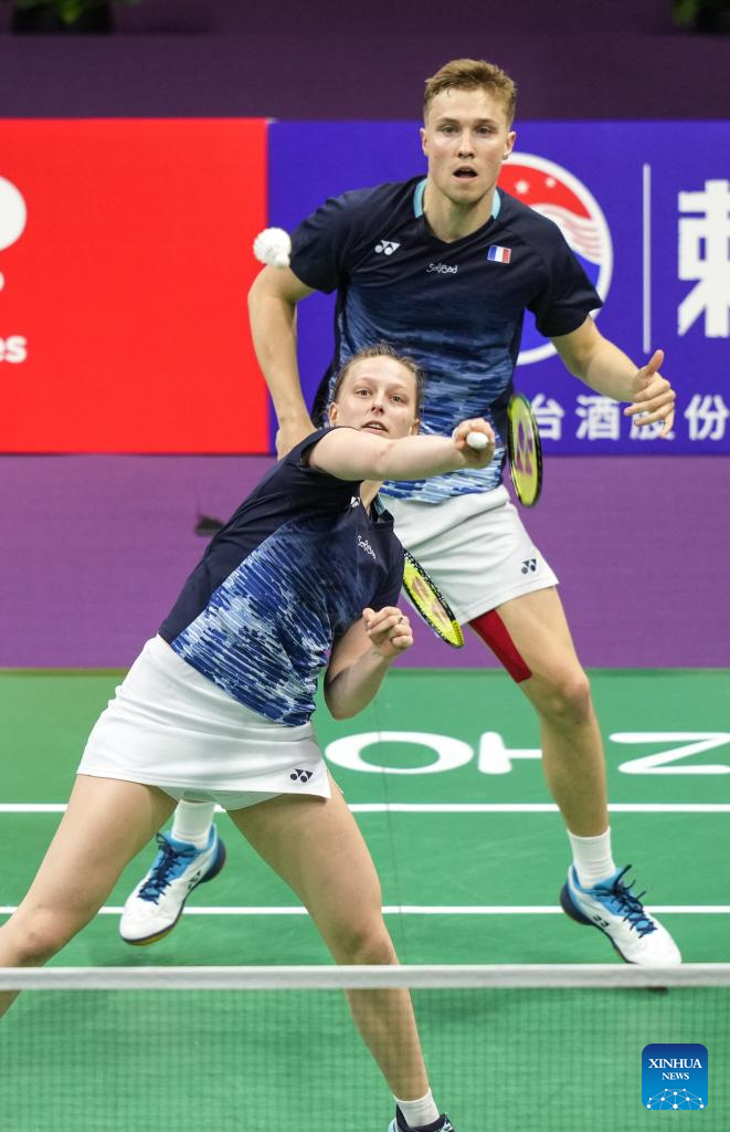 Thom Gicquel (L)/Delphine Delrue of France compete during the mixed doubles match against Marcus Ellis/Lauren Smith of England of the Group D match between France and England at BWF Sudirman Cup in Suzhou, east China's Jiangsu Province, May 17, 2023. (Xinhua/Yang Lei)