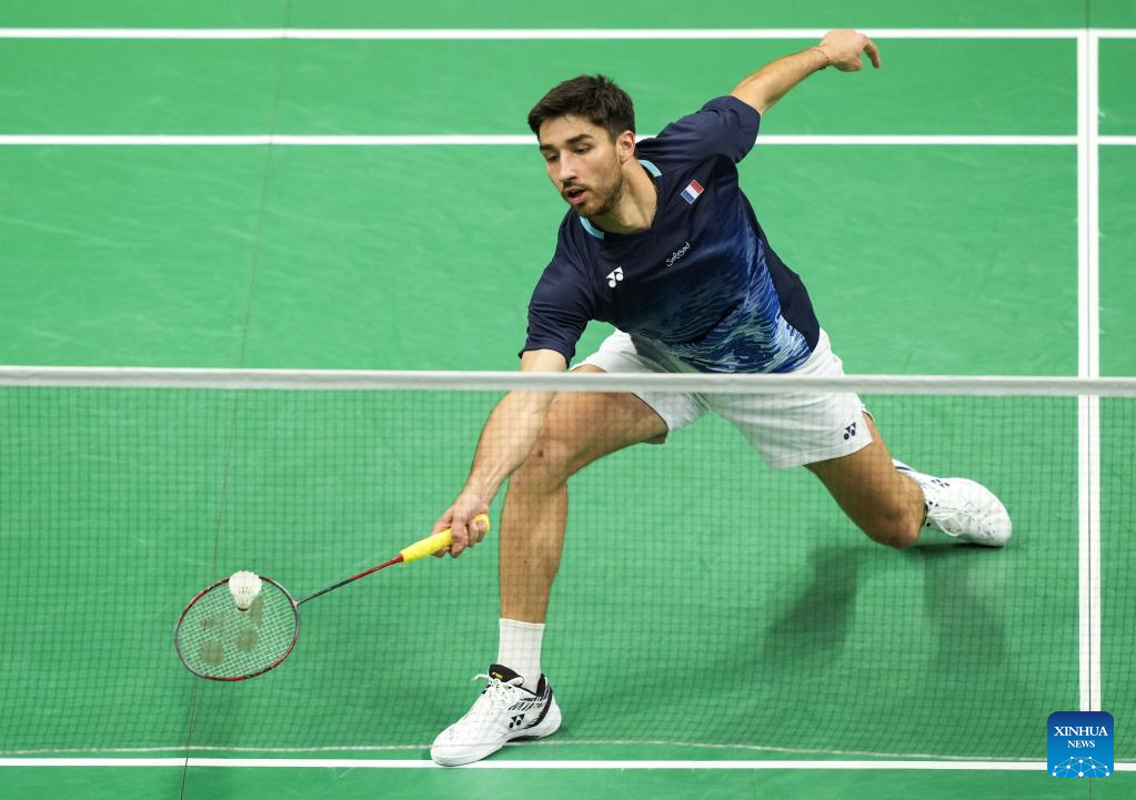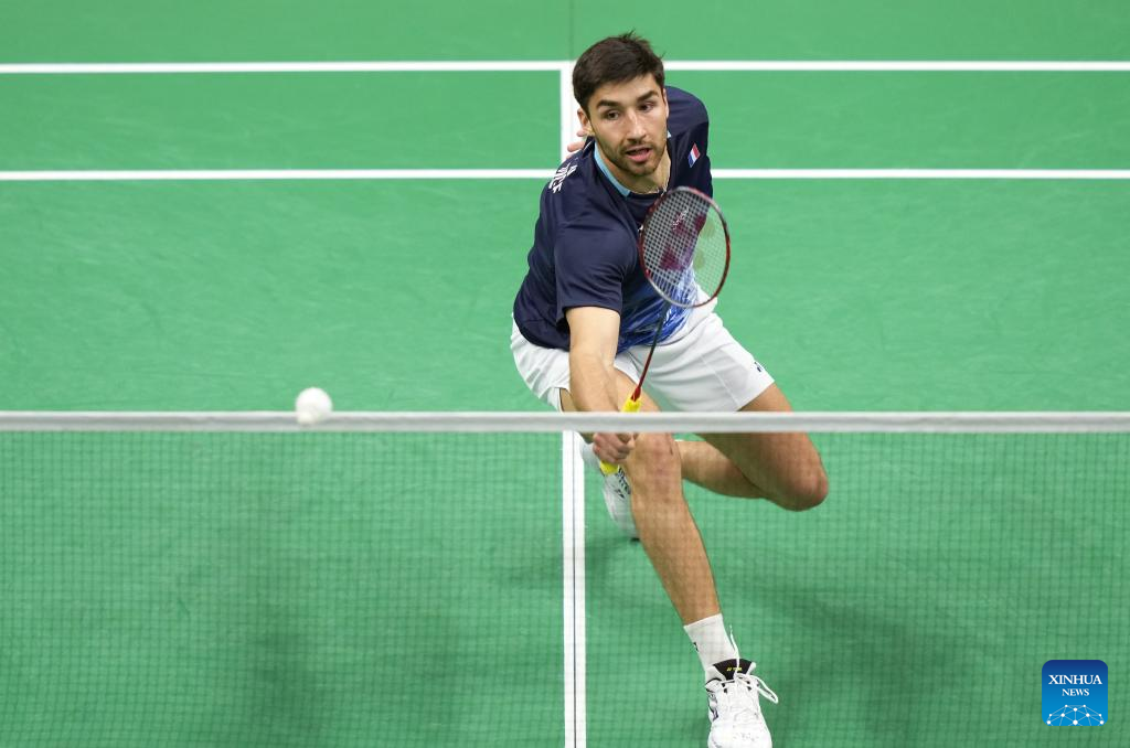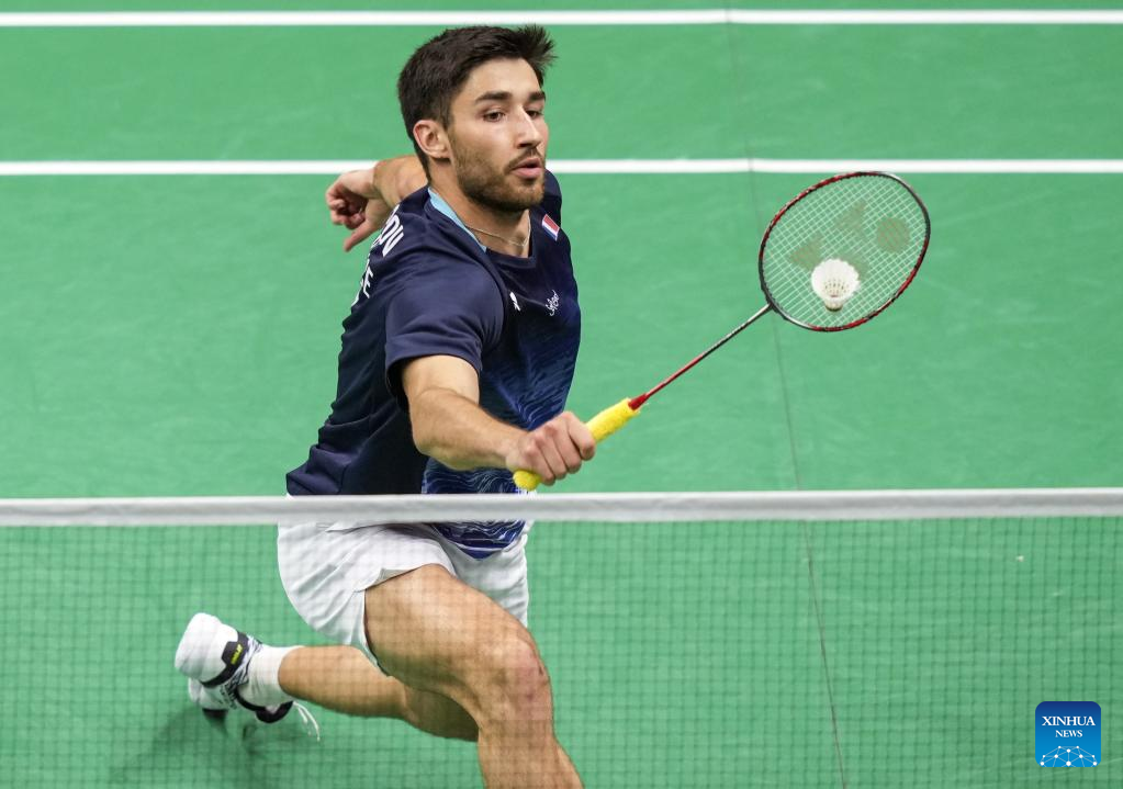 Toma Junior Popov of France hits a return during the men's singles match against Cholan Kayan of England of the Group D match between France and England at BWF Sudirman Cup in Suzhou, east China's Jiangsu Province, May 17, 2023. (Xinhua/Yang Lei)