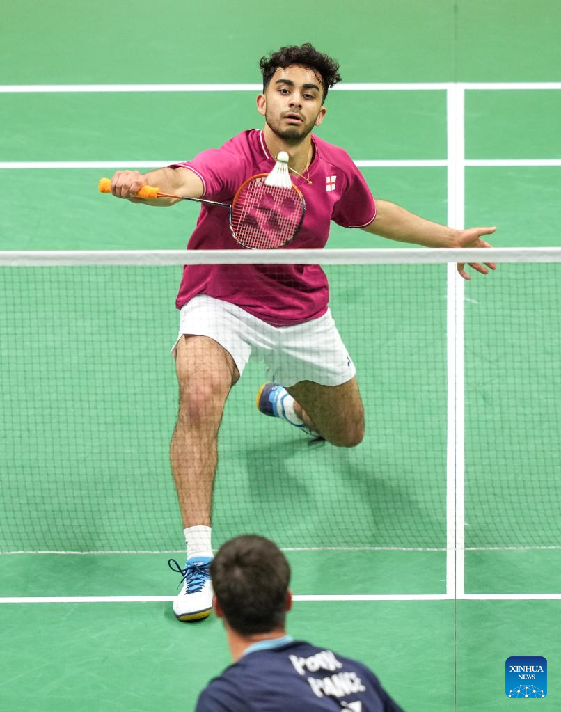 Cholan Kayan of England hits a return during the men's singles match against Toma Junior Popov of France of the Group D match between France and England at BWF Sudirman Cup in Suzhou, east China's Jiangsu Province, May 17, 2023. (Xinhua/Yang Lei)