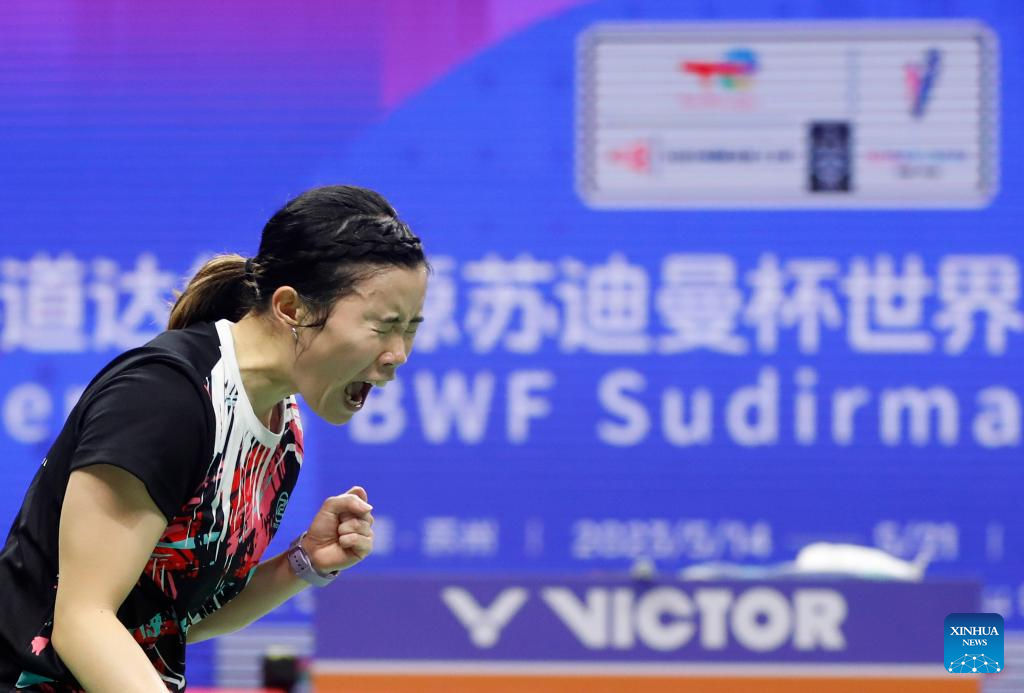 Tiffany Ho of Australia celebrates during the women's singles match against Anupama Upadhyaya of India during the group C match between India and Australia at BWF Sudirman Cup in Suzhou, east China's Jiangsu Province, May 17, 2023. (Xinhua/Jia Haocheng)