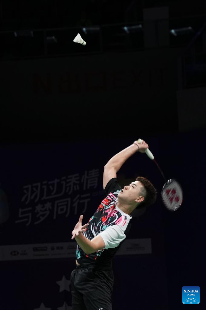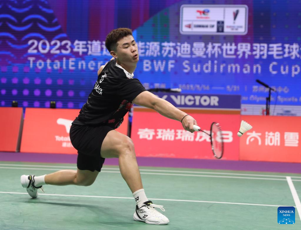 Nishimoto Kenta of Japan hits a return during the men's singles match against Jeon Hyeok Jin of South Korea of Group D match between Japan and South Korea at BWF Sudirman Cup in Suzhou, east China's Jiangsu Province, May 17, 2023. (Xinhua/Du Yu)