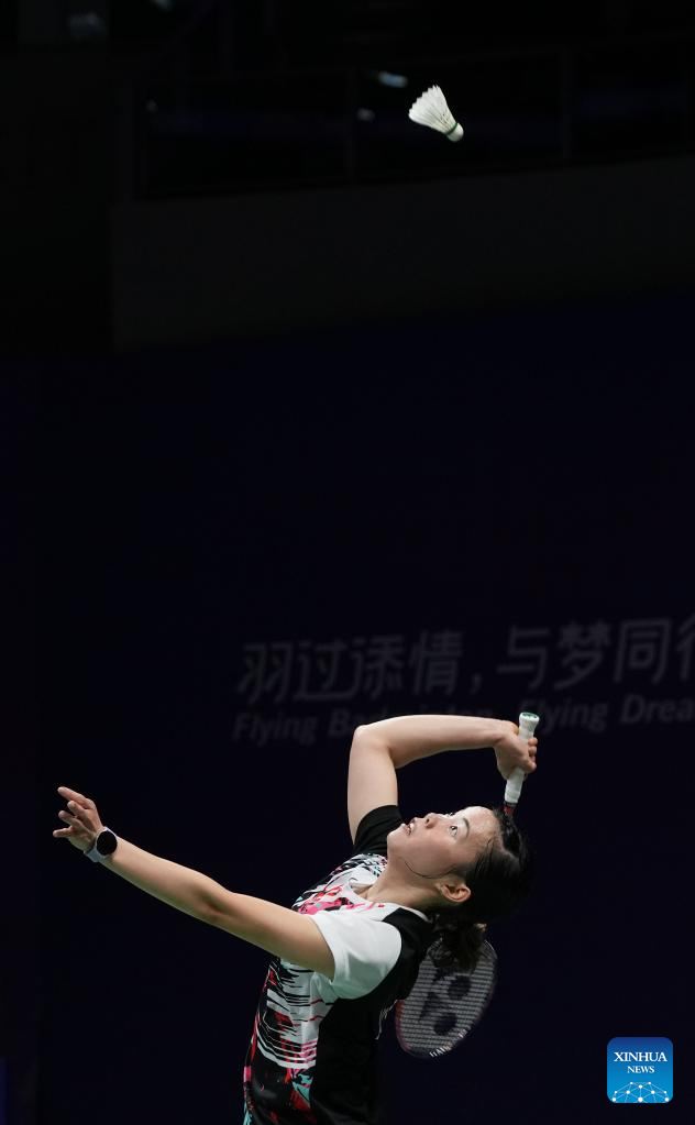 Yamaguchi Akane of Japan hits a return during the women's singles match against An Se Young of South Korea of Group D match between Japan and South Korea at BWF Sudirman Cup in Suzhou, east China's Jiangsu Province, May 17, 2023. (Xinhua/Hou Zhaokang)