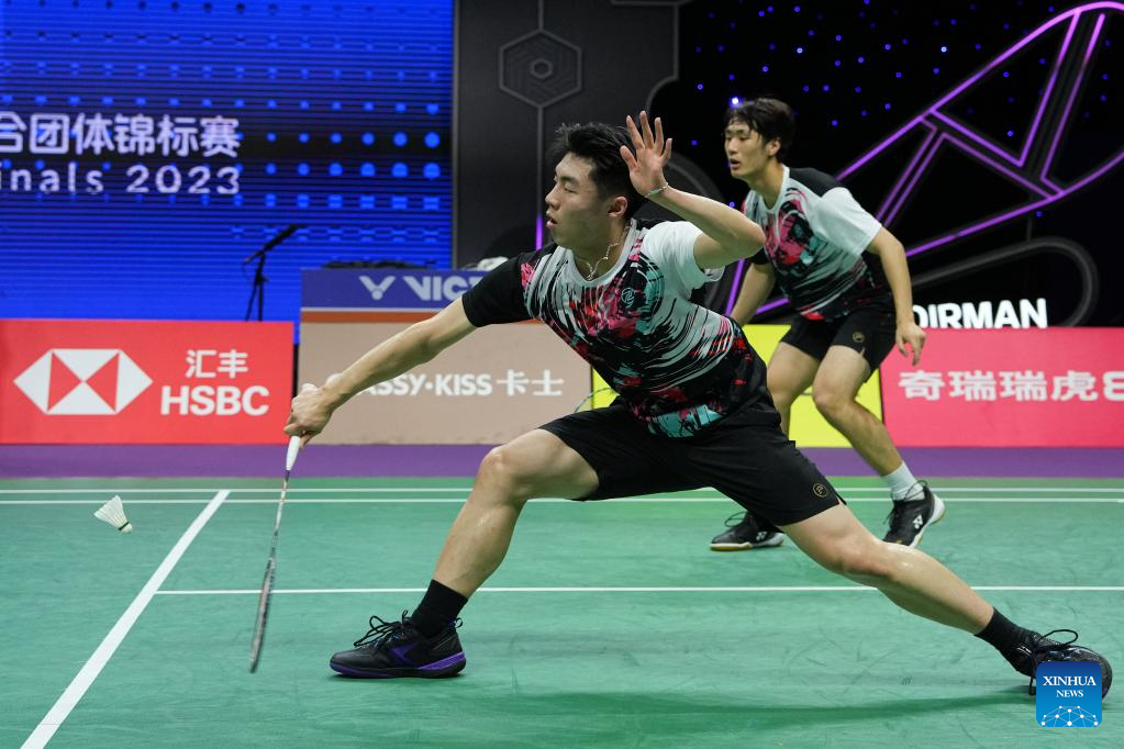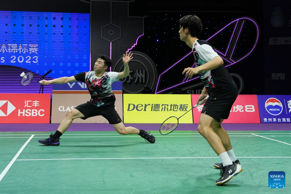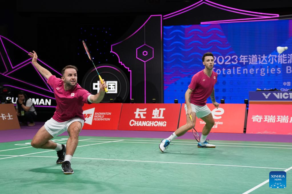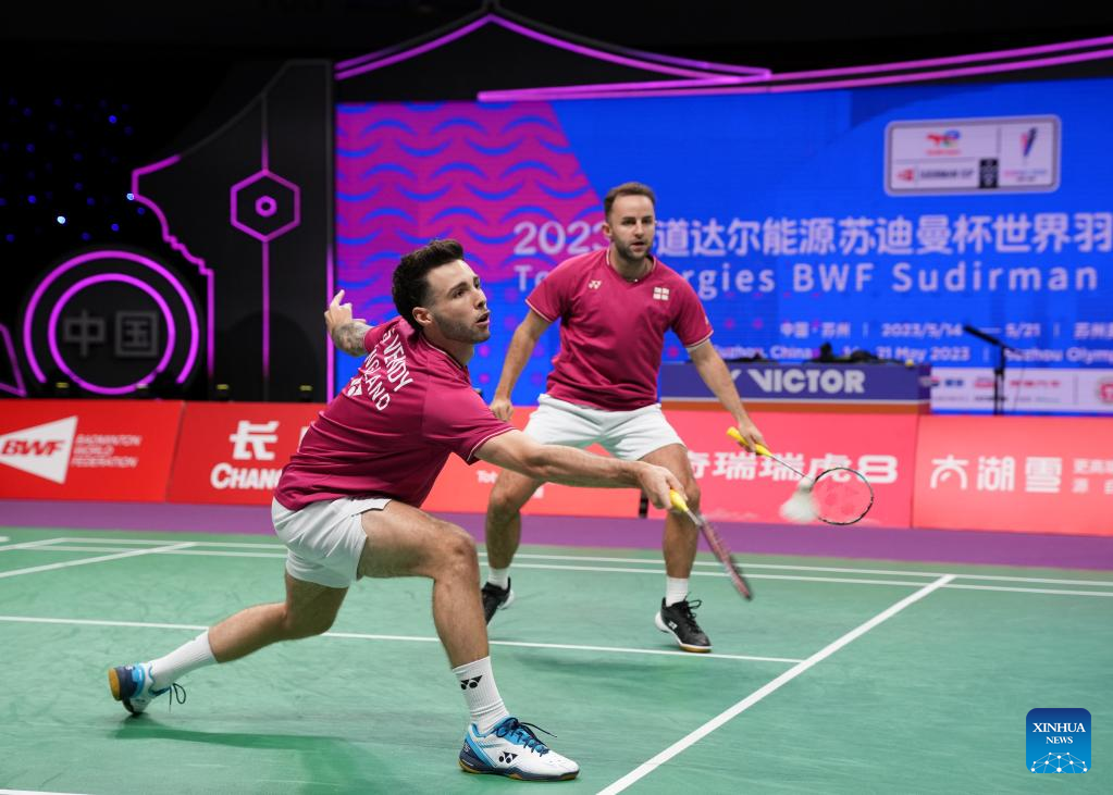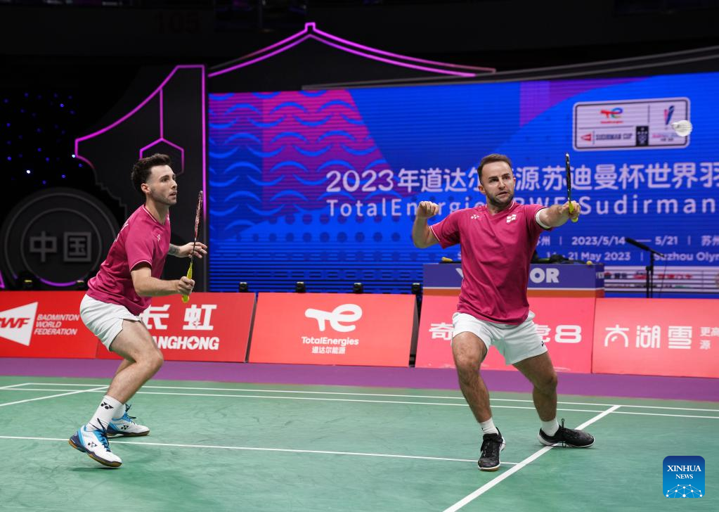 Ben Lane (L)/Sean Vendy of England compete during the men's doubles match against Lucas Corvee/Ronan Labar of France of the Group D match between France and England at BWF Sudirman Cup in Suzhou, east China's Jiangsu Province, May 17, 2023. (Xinhua/Liu Wenhui)