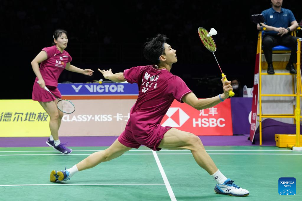 Kim Won Ho/Jeong Na Eun (Front) of South Korea compete during the mixed doubles match against Watanabe Yuta/Higashino Arisa of Japan of Group D match between Japan and South Korea at BWF Sudirman Cup in Suzhou, east China's Jiangsu Province, May 17, 2023. (Xinhua/Jia Haocheng)