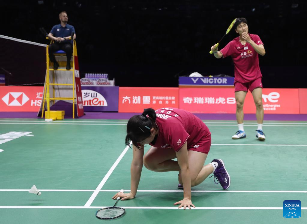 Kim Won Ho (Front)/Jeong Na Eun of South Korea compete during the mixed doubles match against Watanabe Yuta/Higashino Arisa of Japan of Group D match between Japan and South Korea at BWF Sudirman Cup in Suzhou, east China's Jiangsu Province, May 17, 2023. (Xinhua/Du Yu)