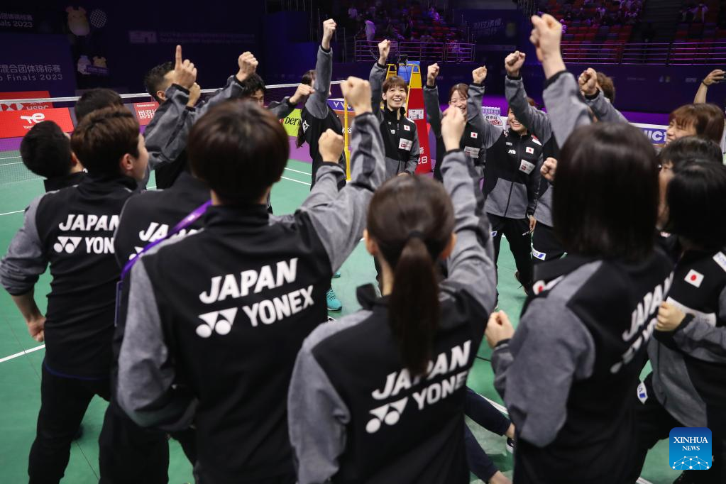 Players of Japan cheer prior to the mixed doubles match of Group D match between Japan and South Korea at BWF Sudirman Cup in Suzhou, east China's Jiangsu Province, May 17, 2023. (Xinhua/Jia Haocheng)