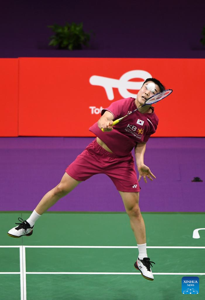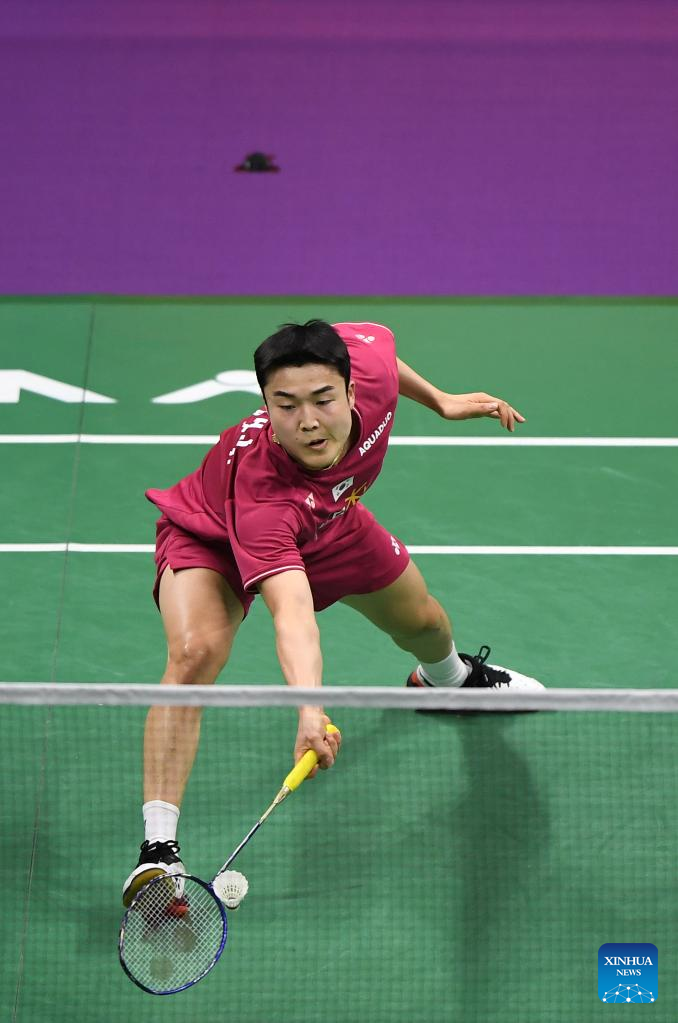 Jeon Hyeok Jin of South Korea competes during the men's singles match against Nishimoto Kenta of Japan of Group D match between Japan and South Korea at BWF Sudirman Cup in Suzhou, east China's Jiangsu Province, May 17, 2023. (Xinhua/Hou Zhaokang)