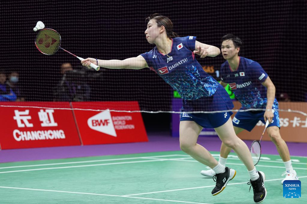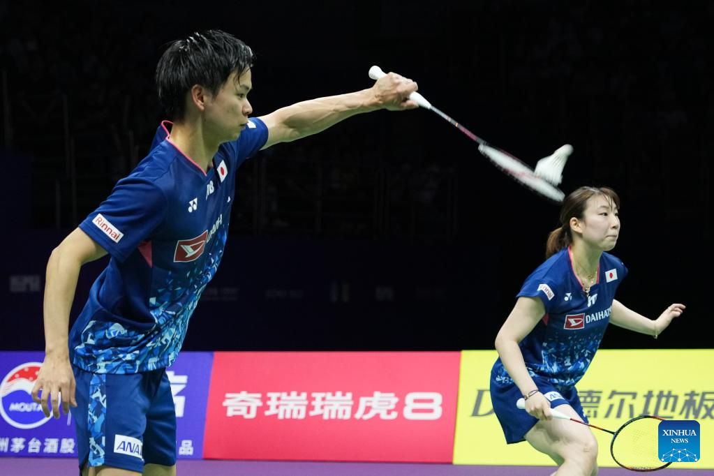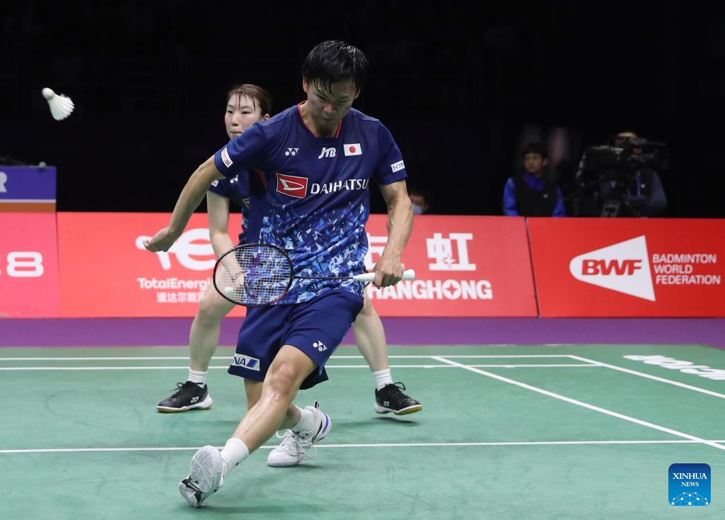 Watanabe Yuta (Front)/Higashino Arisa of Japan compete during the mixed doubles match against Kim Won Ho/Jeong Na Eun of South Korea of Group D match between Japan and South Korea at BWF Sudirman Cup in Suzhou, east China's Jiangsu Province, May 17, 2023. (Xinhua/Jia Haocheng)