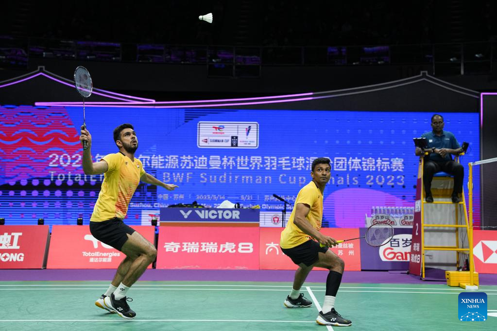 Dhruv Kapila (L) /M.R. Arjun of India compete during the men's doubles match against Rayne Wang/Ricky Tang of Australia during the group C match between India and Australia at BWF Sudirman Cup in Suzhou, east China's Jiangsu Province, May 17, 2023. (Xinhua/Du Yu)