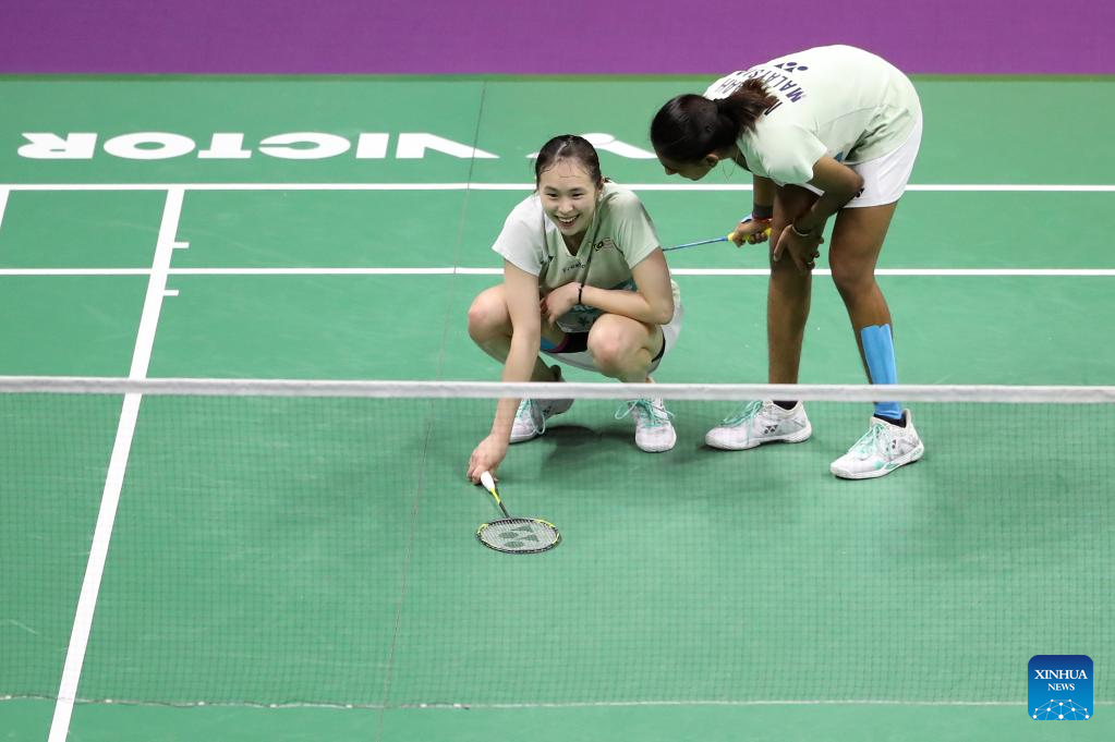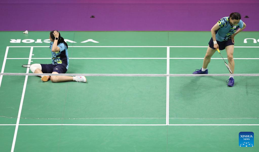 Tan Pearly (L)/Thinaah Muralitharan of Malaysia react in the women's doubles match against Hsu Ya Ching/Teng Chun Hsun of Chinese Taipei during the group C match between Malaysia and Chinese Taipei at BWF Sudirman Cup in Suzhou, east China's Jiangsu Province, May 17, 2023. (Xinhua/Jia Haocheng)