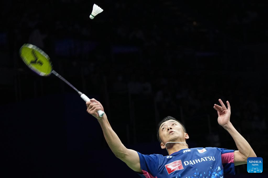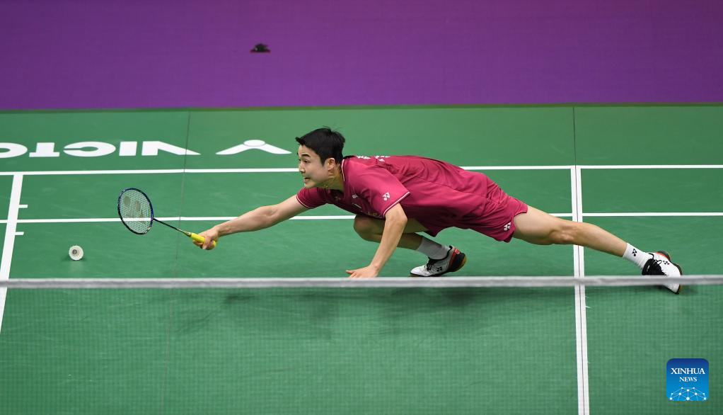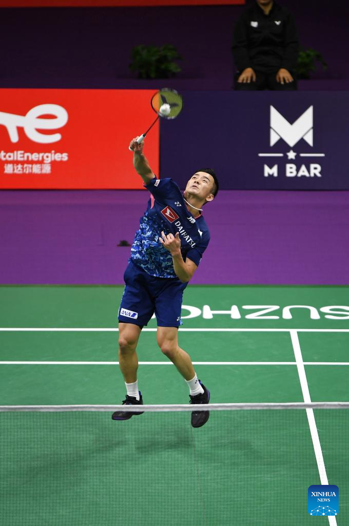 Nishimoto Kenta of Japan competes during the men's singles match against Jeon Hyeok Jin of South Korea of Group D match between Japan and South Korea at BWF Sudirman Cup in Suzhou, east China's Jiangsu Province, May 17, 2023. (Xinhua/Hou Zhaokang)