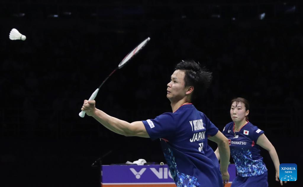 Watanabe Yuta (Front)/Higashino Arisa of Japan compete during the mixed doubles match against Kim Won Ho/Jeong Na Eun of South Korea of Group D match between Japan and South Korea at BWF Sudirman Cup in Suzhou, east China's Jiangsu Province, May 17, 2023. (Xinhua/Du Yu)