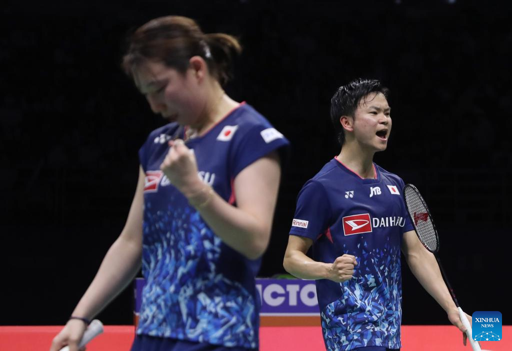 Watanabe Yuta (R)/Higashino Arisa of Japan celebrate during the mixed doubles match against Kim Won Ho/Jeong Na Eun of South Korea of Group D match between Japan and South Korea at BWF Sudirman Cup in Suzhou, east China's Jiangsu Province, May 17, 2023. (Xinhua/Jia Haocheng)