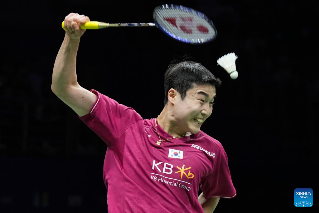 Jeon Hyeok Jin of South Korea hits a return during the men's singles match against Nishimoto Kenta of Japan of Group D match between Japan and South Korea at BWF Sudirman Cup in Suzhou, east China's Jiangsu Province, May 17, 2023. (Xinhua/Hou Zhaokang)