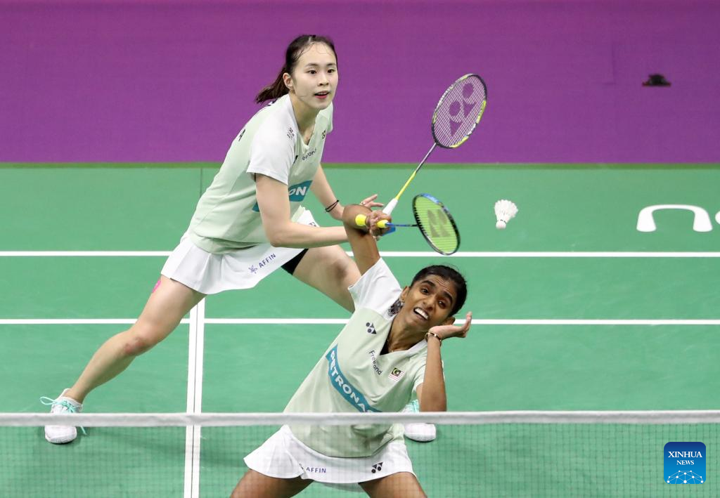 Tan Pearly (Top)/Thinaah Muralitharan of Malaysia compete in the women's doubles match against Hsu Ya Ching/Teng Chun Hsun of Chinese Taipei during the group C match between Malaysia and Chinese Taipei at BWF Sudirman Cup in Suzhou, east China's Jiangsu Province, May 17, 2023. (Xinhua/Jia Haocheng)