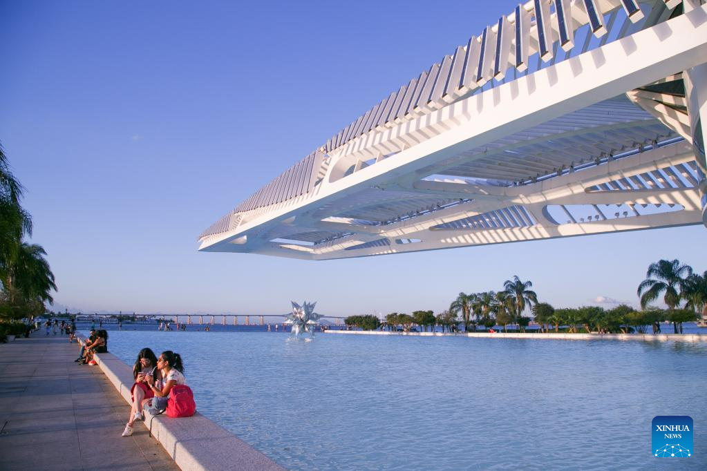 People rest outside the Museum of Tomorrow in Rio de Janeiro, Brazil, May 16, 2023. The museum is a landmark of Rio de Janeiro and a space meant to explore, imagine, and conceive all the possibilities for constructing the future. (Photo by Claudia Martini/Xinhua)