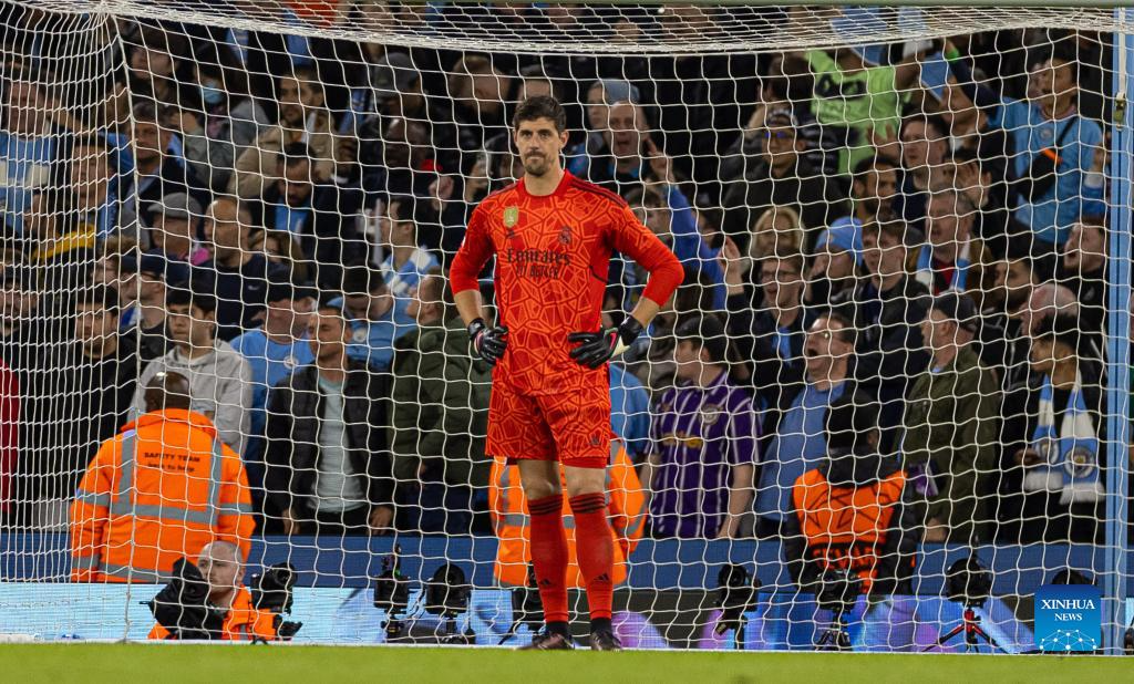 Real Madrid's goalkeeper Thibaut Courtois looks dejected during the UEFA Champions League semifinal 2nd Leg match between Manchester City and Real Madrid in Manchester, Britain, on May 17, 2023. (Xinhua)