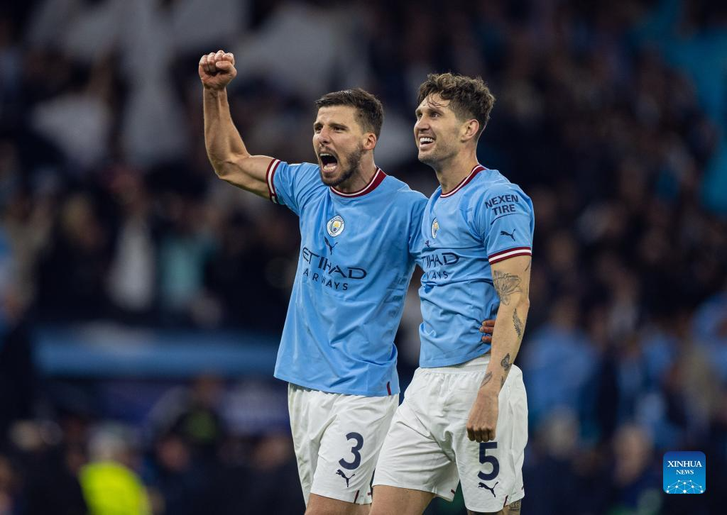 Manchester City's Ruben Dias (L) and John Stones celebrate after the UEFA Champions League semifinal 2nd Leg match between Manchester City and Real Madrid in Manchester, Britain, on May 17, 2023. (Xinhua)