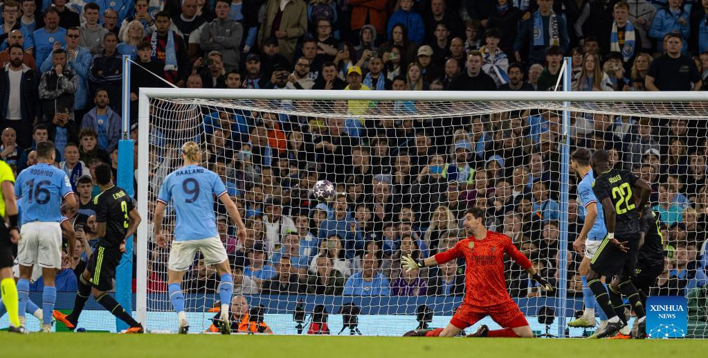 Real Madrid's goalkeeper Thibaut Courtois (4th L) fails to save the goal by Manchester City's Manuel Akanji (not in the picture) during the UEFA Champions League semifinal 2nd Leg match between Manchester City and Real Madrid in Manchester, Britain, on May 17, 2023. (Xinhua)