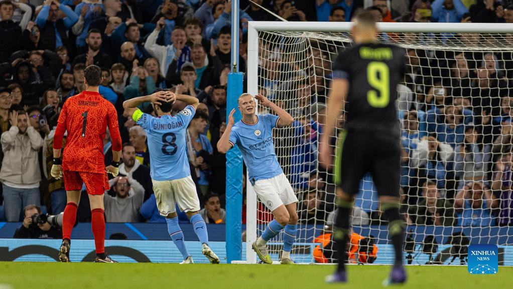 Manchester City's Erling Haaland (3rd L) looks dejected after missing a chance during the UEFA Champions League semifinal 2nd Leg match between Manchester City and Real Madrid in Manchester, Britain, on May 17, 2023. (Xinhua)