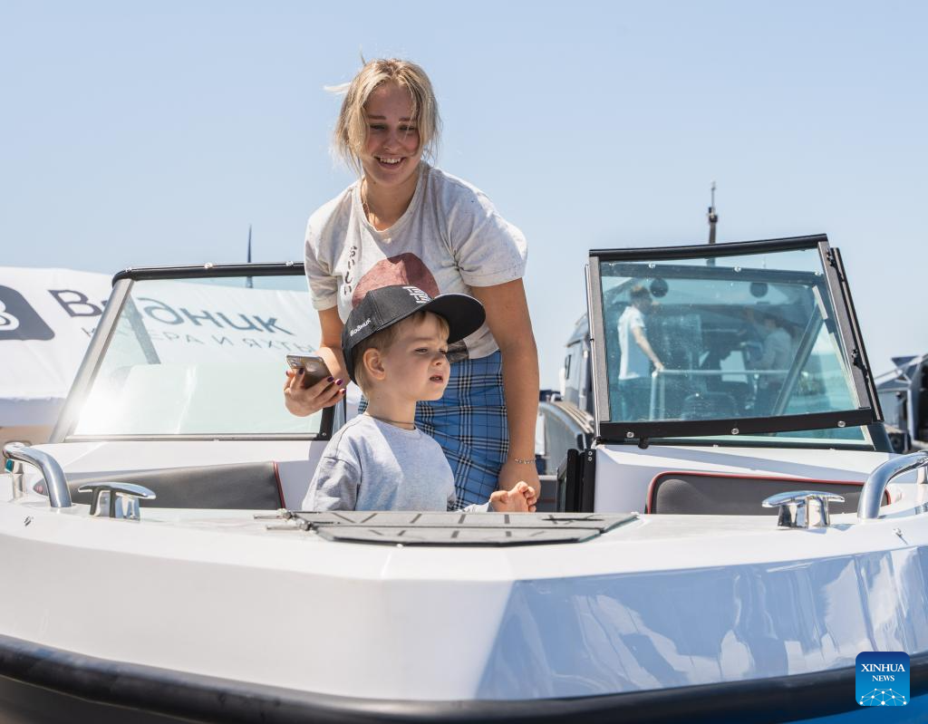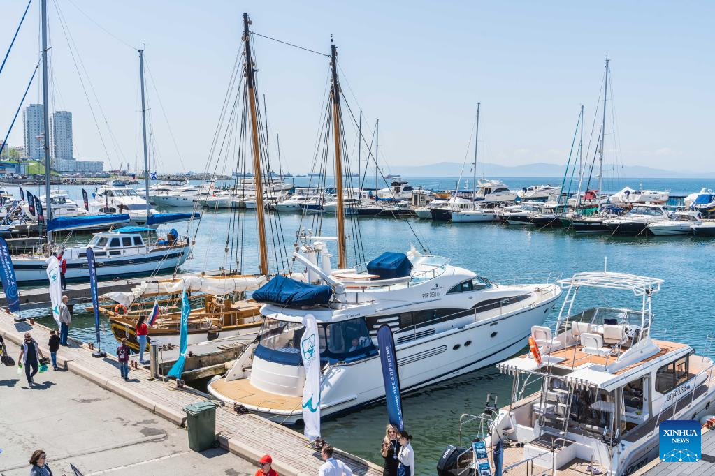 This photo taken on May 19, 2023 shows a yacht show in Vladivostok, Russia. A yacht show was held in Vladivostok Friday, exhibiting products of the world's yacht manufacturers. (Photo by Guo Feizhou/Xinhua)
