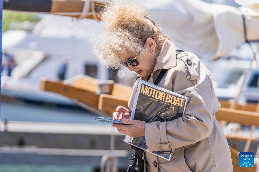 A woman holds a Motor Boat and Yacht magazine at the yacht show in Vladivostok, Russia, May 19, 2023. A yacht show was held in Vladivostok Friday, exhibiting products of the world's yacht manufacturers. (Photo by Guo Feizhou/Xinhua)
