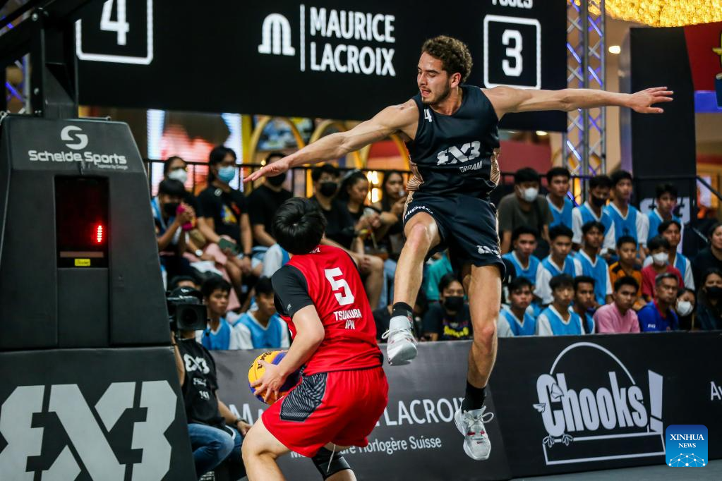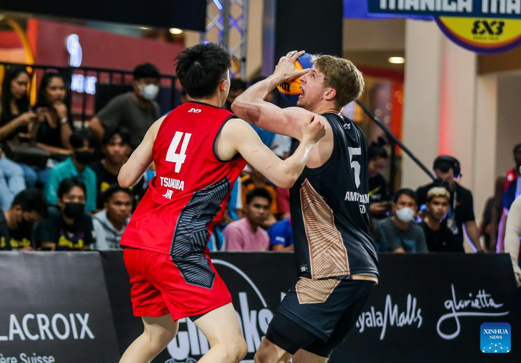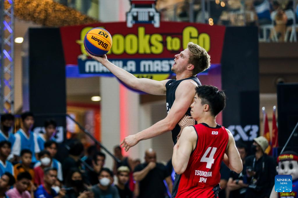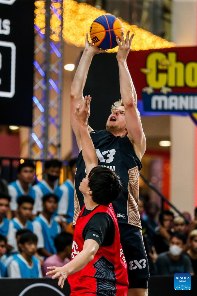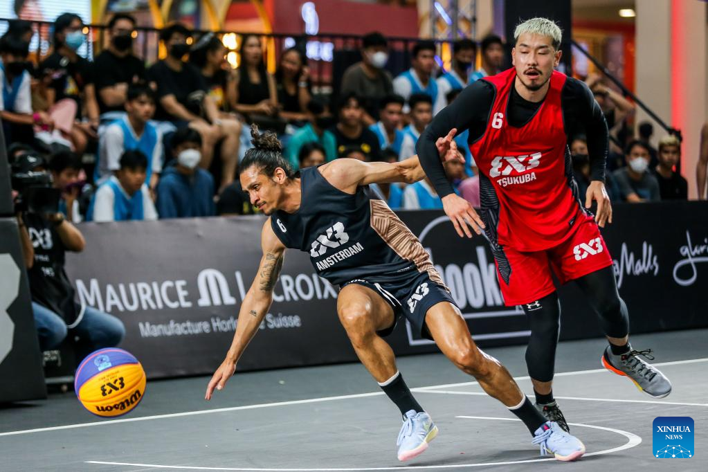 Norbert Thelissen (R) of Amsterdam HiPRO competes against Reon Yahatabara of Tsukuba Alborada during the Pool C match between Amsterdam HiPRO from the Netherlands and Tsukuba Alborada from Japan in the FIBA 3x3 World Tour Manila Masters 2023 in Makati City, the Philippines on May 20, 2023. (Xinhua/Rouelle Umali)