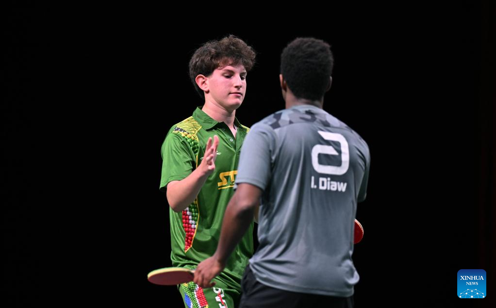 Dean Levy (L) of South Africa and Ibrahima Diaw of Senegal shake hands after the first round of men's singles at 2023 ITTF Table Tennis World Championships Finals in Durban, South Africa, May 20, 2023. (Xinhua/Tao Xiyi)