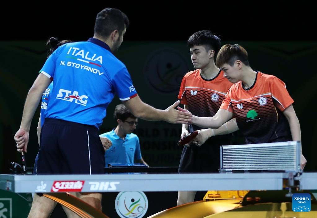 Players of both sides greet each other after the first round of mixed doubles match between Lin Yun-Ju/Chen Szu-Yu of Chinese Taipei and Niagol Stoyanov/Giorgia Piccolin of Italy at 2023 ITTF Table Tennis World Championships Finals in Durban, South Africa, May 20, 2023. (Xinhua/Wang Dongzhen)