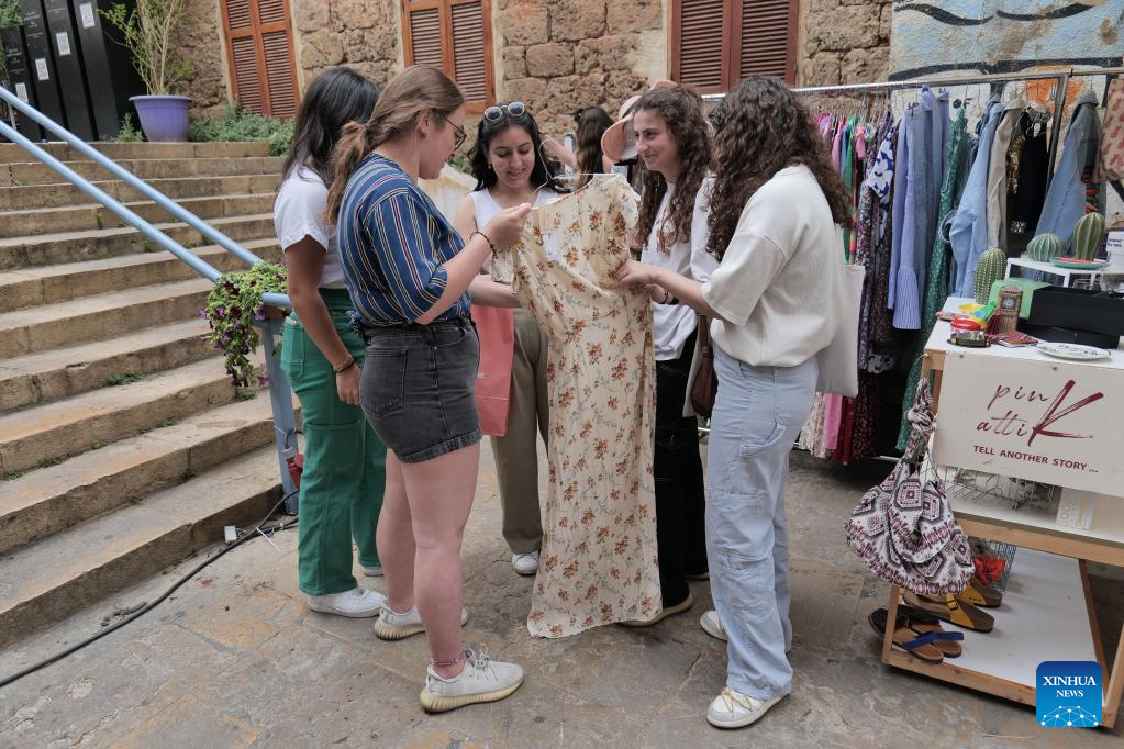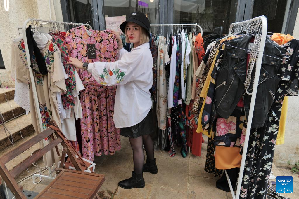 People look at a dress at a flea market exhibition at St. Nicholas Stairs in Beirut, Lebanon, on May 19, 2023. The flea market exhibition is held here from May 19 to May 21. (Photo by Dana Halawi/Xinhua)