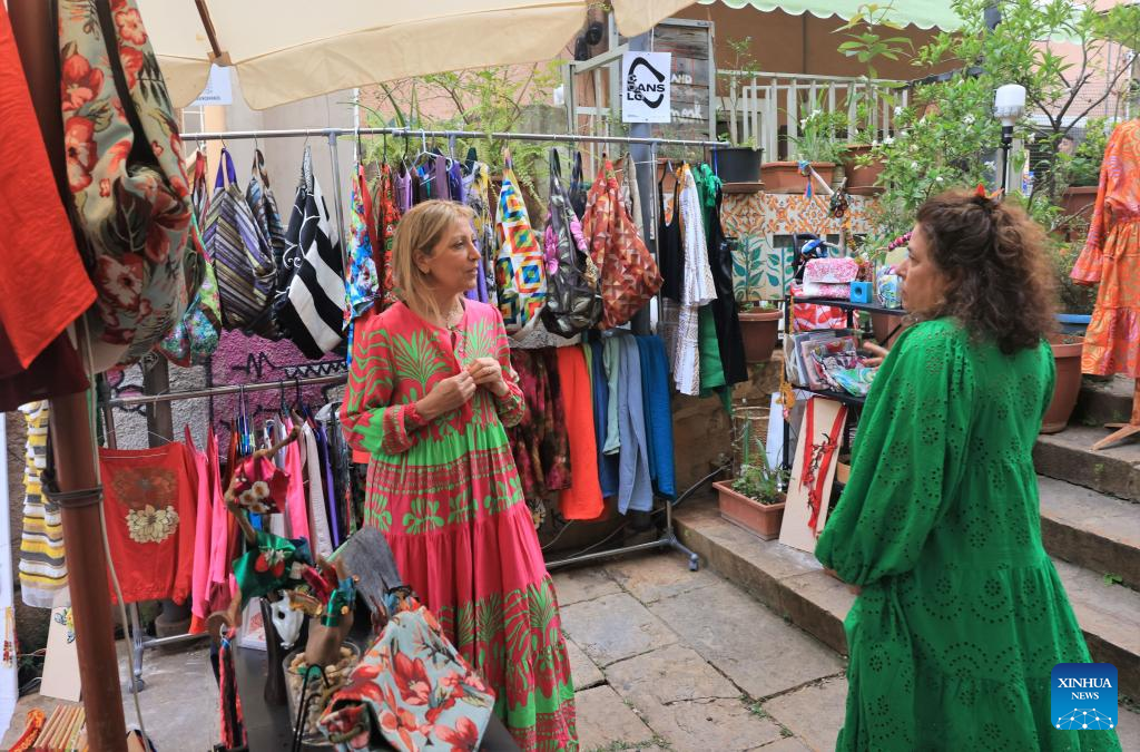 People talk in front of a clothing stall at a flea market exhibition at St. Nicholas Stairs in Beirut, Lebanon, on May 19, 2023. The flea market exhibition is held here from May 19 to May 21. (Xinhua/Liu Zongya)