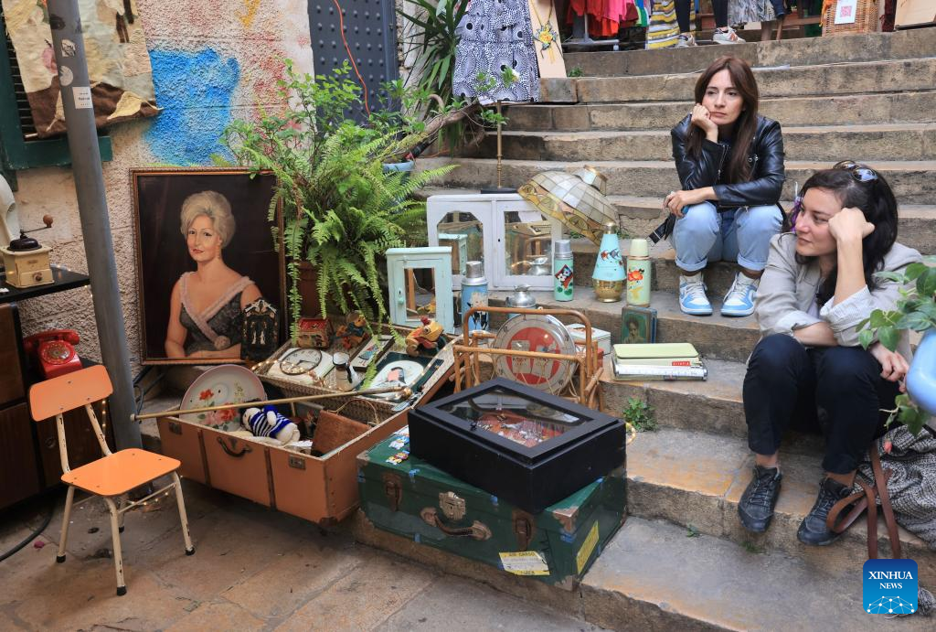 Exhibitors sit beside their stall at a flea market exhibition at St. Nicholas Stairs in Beirut, Lebanon, on May 19, 2023. The flea market exhibition is held here from May 19 to May 21. (Xinhua/Liu Zongya)