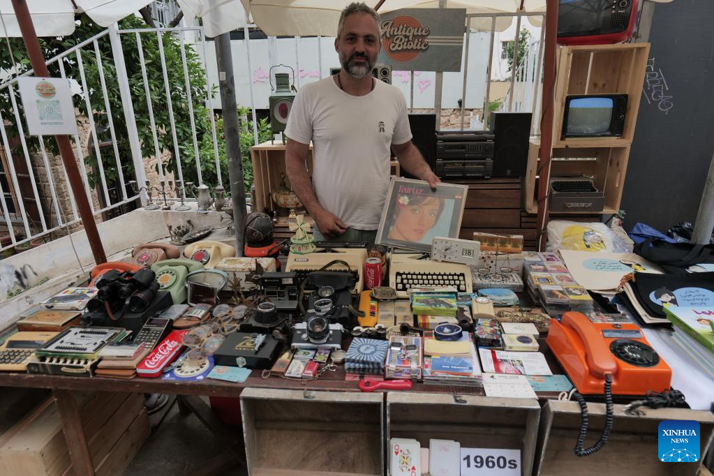 A man stands behind his stall at a flea market exhibition at St. Nicholas Stairs in Beirut, Lebanon, on May 19, 2023. The flea market exhibition is held here from May 19 to May 21. (Photo by Dana Halawi/Xinhua)