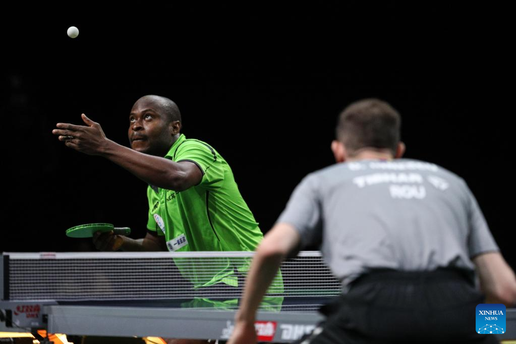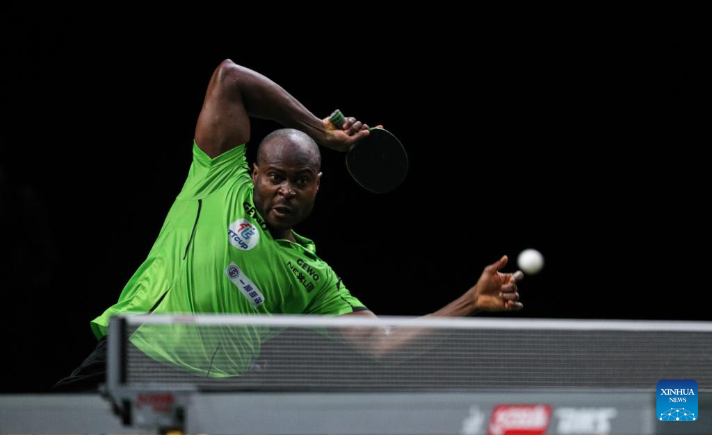 Quadri Aruna of Nigeria competes during the first round of men's singles between Quadri Aruna of Nigeria and Ovidiu Ionescu of Romania at 2023 ITTF Table Tennis World Championships Finals in Durban, South Africa, May 20, 2023. (Xinhua/Han Xu)