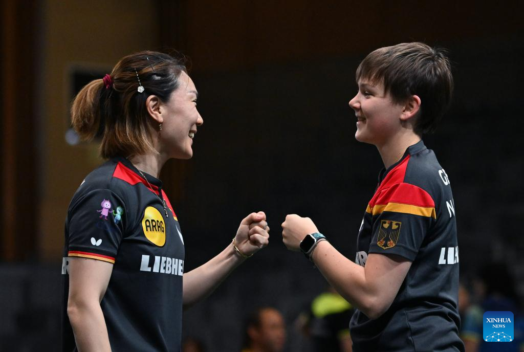 Nina Mittelham(R)/Shan Xiaona of Germany celebrate after defeating Choi Hyojoo/Lee Zion of South Korea during the women's doubles 1st round match at 2023 ITTF Table Tennis World Championships Finals in Durban, South Africa, May 20, 2023. (Xinhua/Tao Xiyi)