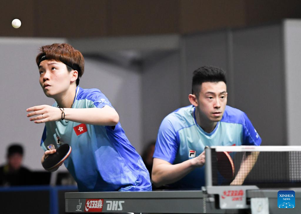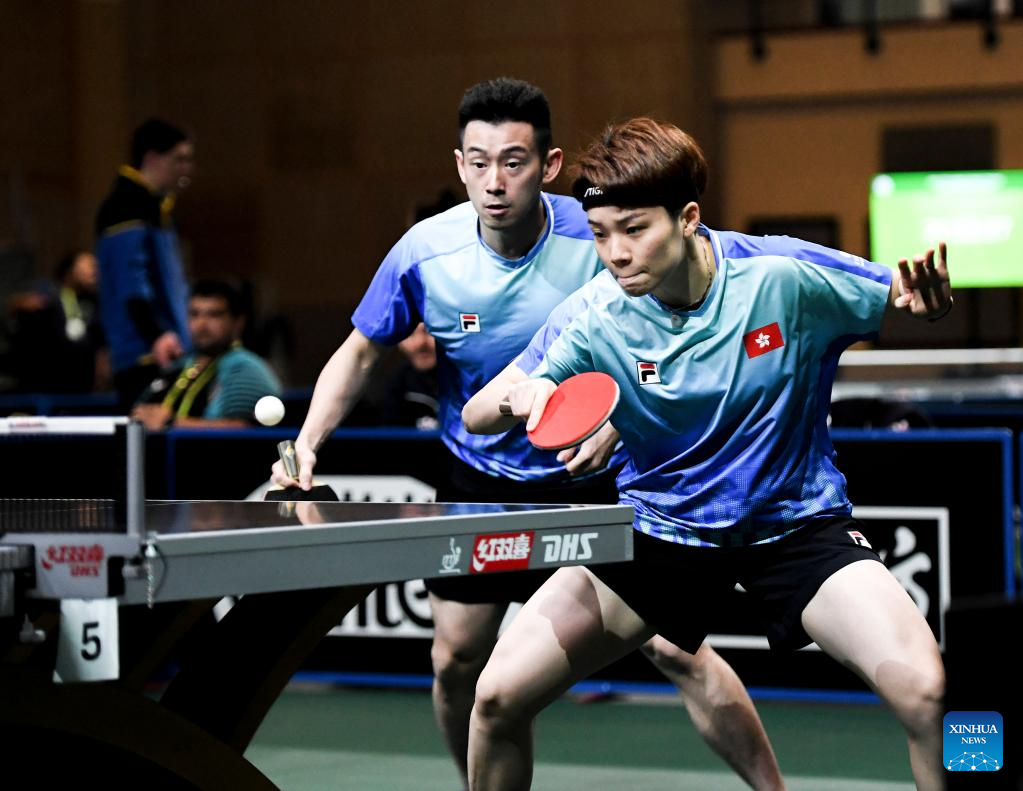 Wong Chun Ting/Doo Hoi Kem (R) of China's Hong Kong compete during the first round of mixed doubles between Wong Chun Ting/Doo Hoi Kem of China's Hong Kong and John Oyebode/Gaia Monfardini of Italy at 2023 ITTF Table Tennis World Championships Finals in Durban, South Africa, May 20, 2023. (Xinhua/Li Yahui)