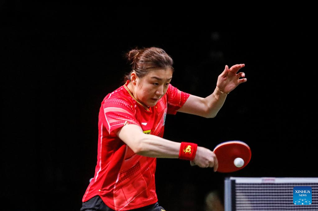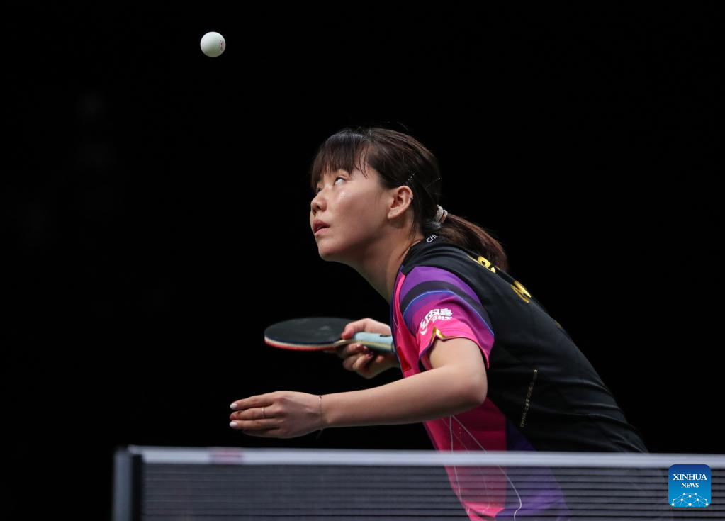 Chen Meng of China hits a return during the first round match of women's singles between Chen Meng of China and Yousra Helmy of Egypt at 2023 ITTF Table Tennis World Championships Finals in Durban, South Africa, May 20, 2023. (Xinhua/Li Yahui)