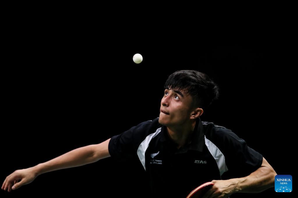 Alfred Dela Pena of New Zealand serves during the first round of men's singles between Liang Jingkun of China and Alfred Dela Pena of New Zealand at 2023 ITTF Table Tennis World Championships Finals in Durban, South Africa, May 20, 2023. (Xinhua/Zhang Yudong)