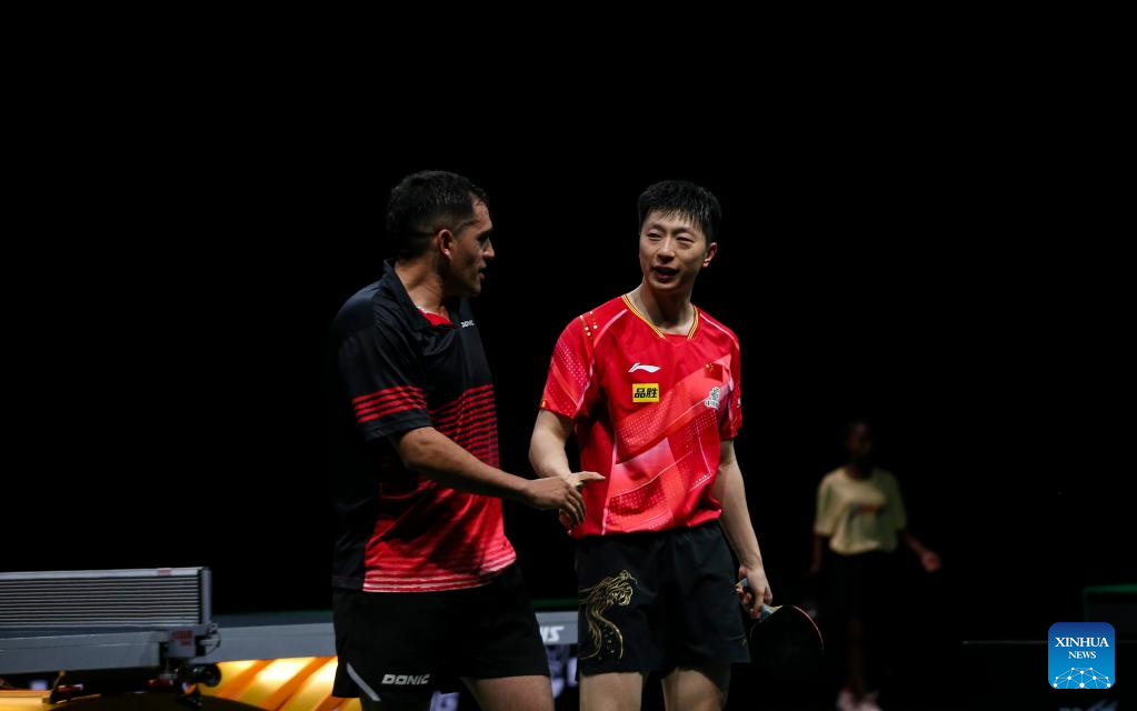 Ma Long (R) of China talks to Gaston Alto of Argentina after the first round of men's single of Argentina at 2023 ITTF Table Tennis World Championships Finals in Durban, South Africa, May 20, 2023. (Xinhua/Zhang Yudong)