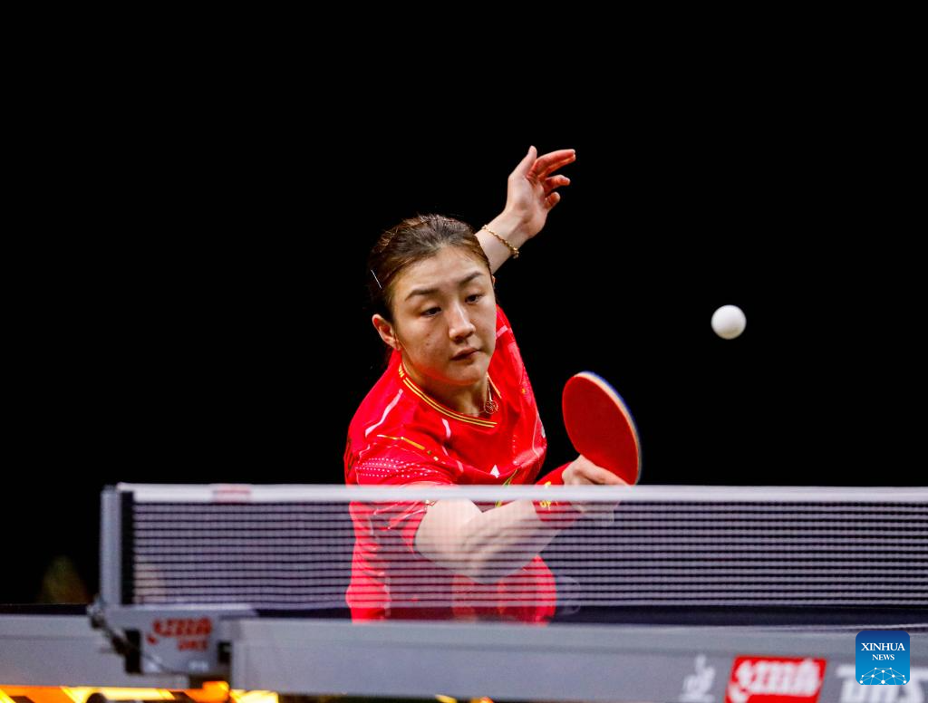 Chen Xingtong (R) of China hits a return during the first round of wowen's singles between Sarah De Nutte of Luxembourg and Chen Xingtong of China at 2023 ITTF Table Tennis World Championships Finals in Durban, South Africa, May 20, 2023. (Xinhua/Han Xu)