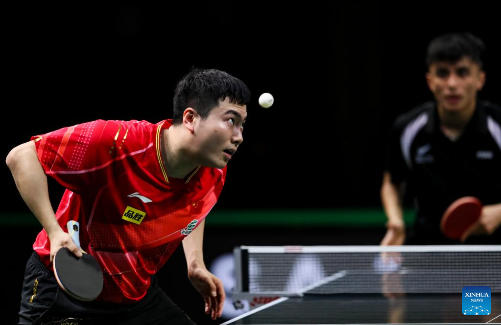Liang Jingkun (L) of China serves during the first round of men's singles between Liang Jingkun of China and Alfred Dela Pena of New Zealand at 2023 ITTF Table Tennis World Championships Finals in Durban, South Africa, May 20, 2023. (Xinhua/Zhang Yudong)