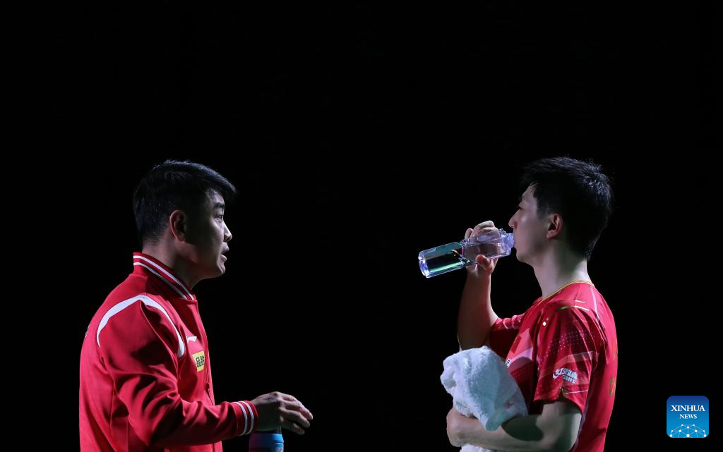 Coach Wang Hao (L) instructs Ma Long of China during the first round of men's singles between Ma Long of China and Gaston Alto of Argentina at 2023 ITTF Table Tennis World Championships Finals in Durban, South Africa, May 20, 2023. (Xinhua/Wang Dongzhen)