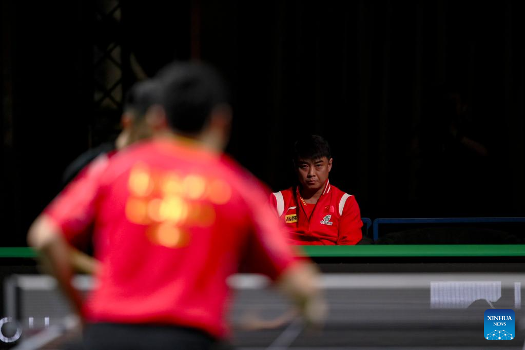Coach Wang Hao (R) of Team China looks on during the first round of men's singles between Liang Jingkun of China and Alfred Dela Pena of New Zealand at 2023 ITTF Table Tennis World Championships Finals in Durban, South Africa, May 20, 2023. (Xinhua/Zhang Yudong)