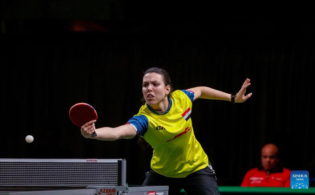 Yousra Helmy of Egypt hits a return during the first round match of women's singles between Chen Meng of China and Yousra Helmy of Egypt at 2023 ITTF Table Tennis World Championships Finals in Durban, South Africa, May 20, 2023. (Xinhua/Li Yahui)