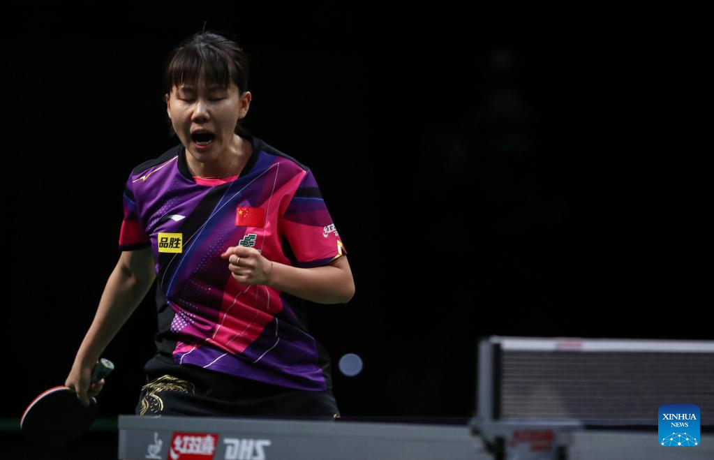 Chen Xingtong of China celebrates during the first round of wowen's singles between Sarah De Nutte of Luxembourg and Chen Xingtong of China at 2023 ITTF Table Tennis World Championships Finals in Durban, South Africa, May 20, 2023. (Xinhua/Han Xu)